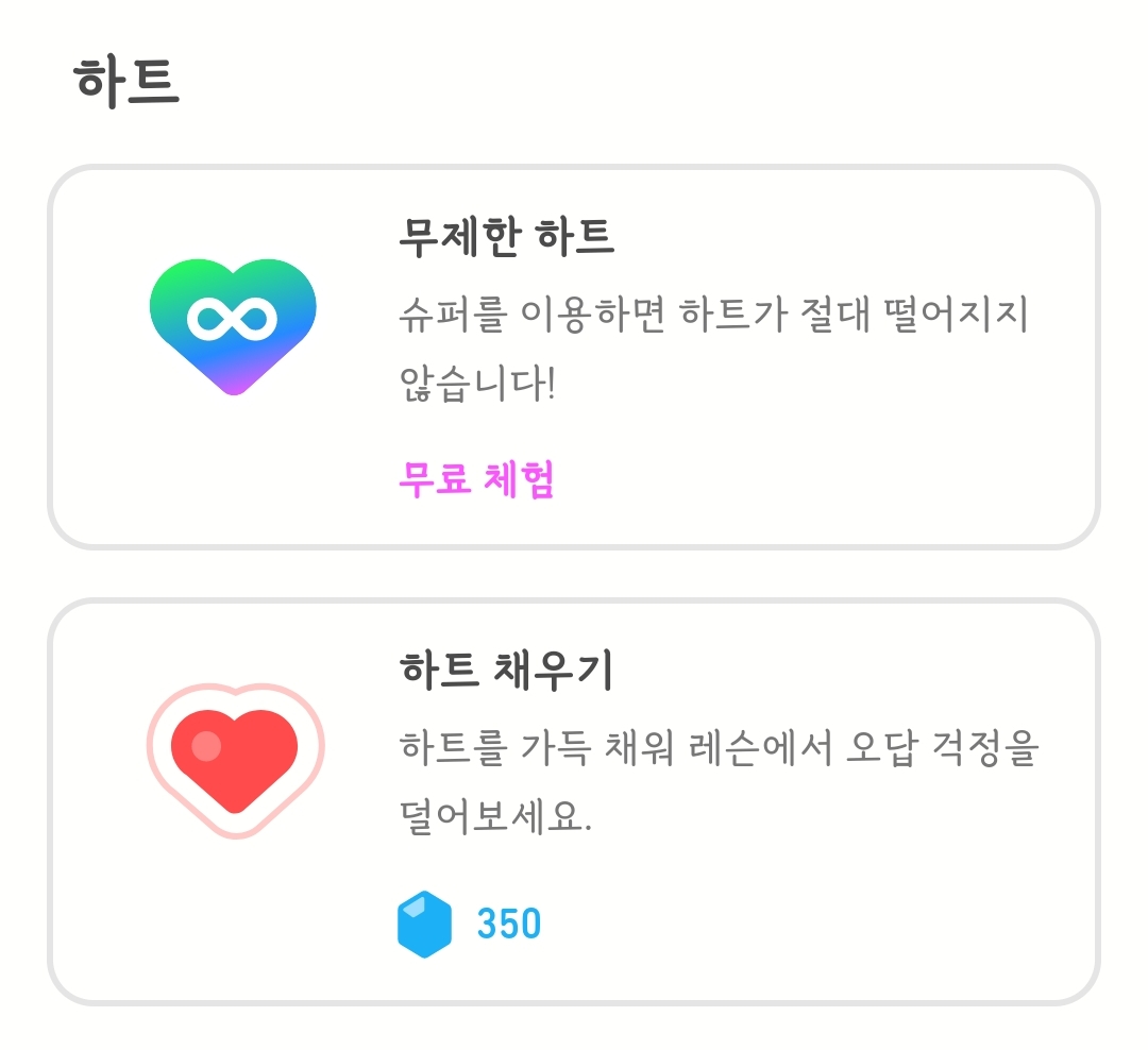 - 하트: 학습 실패 시 소모되는 ‘체력’ 개념, 부족하면 일정 시간 대기하거나 광고 시청 혹은 구매