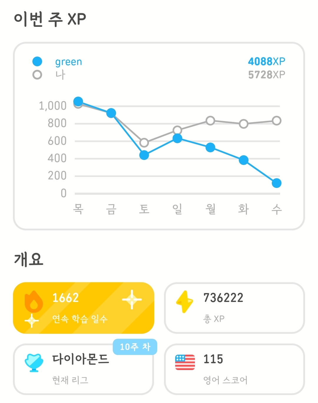30명 단위로 자동 매칭된 리그에서 일주일 동안 누가 가장 많은 XP(경험치)를 얻는가로 경쟁하게 되죠.